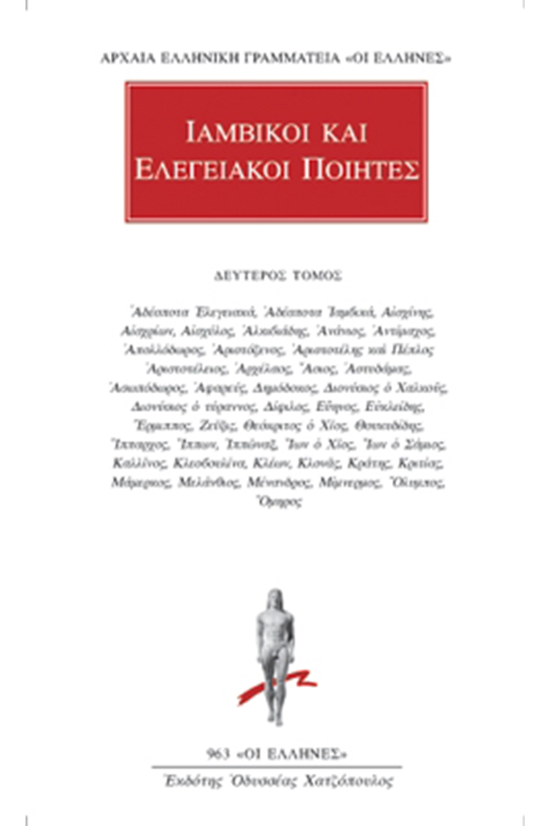 Στον τόμο αυτόν συμπεριλαμβάνονται: α) τα αποσπάσματα του Ιππώνακτα, ποιητή του 6ου αι. π.Χ. από την Έφεσο, ο οποίος χρησιμοποιούσε στα έργα του την καθημερινή γλώσσα του υποκόσμου, πλούσια σε ξενικές και άγνωστες από άλλες πηγές λέξεις· β) τα σωζόμενα αποσπάσματα του Καλλίνου, του πρωιμότερου ελεγειακού ποιητή, διαμορφωτή της πολιτικής-συμβουλευτικής ελεγείας, καθώς και του Μίμνερμου, εισηγητή της ερωτικής αφηγηματικής ελεγείας· γ) τα σωζόμενα αποσπάσματα από τον «Μαργίτη», ένα σκωπτικό ιαμβικό ποίημα που η παράδοση απέδιδε στον Όμηρο· δ) και ελεγειακά αποσπάσματα που διασώζονται χωρίς όνομα ποιητή (αδέσποτα)· ε) ο «Πέπλος» του Αριστοτέλη, μια σειρά επιτύμβιων επιγραμμάτων των μυθικών ηρώων· στ) τα αποσπάσματα από τη «Λύδη» του Αντίμαχου του Κολοφώνιου, ποιητή που έζησε περί το 400 π.Χ. και θεωρείται βασικό πρότυπο της αλεξανδρινής και ρωμαϊκής ερωτικής ελεγείας· ζ) τα σωζόμενα ιαμβικά και ελεγειακά αποσπάσματα διαφόρων άλλων συγγραφέων, όπως οι Αισχίνης, Αισχρίων, Αισχύλος, Αλκιβιάδης, Ανάνιος, Απολλόδωρος, Αριστόξενος, Αρχέλαος, Άσιος, Αστυδάμας, Ασωπόδωρος, Αφαρεύς, Δημόδοκος, Διονύσιος ο Χαλκούς, Διονύσιος ο τύραννος, Δίφιλος, Εύηνος, Ευκλείδης, Έρμιππος, Ζεύξις, Θεόκριτος ο Χίος, Θουκυδίδης, Ίππαρχος, Ίππων, Ίων ο Χίος, Ίων ο Σάμιος, Κλεοβουλίνα, Κλέων, Κλονάς, Κράτης, Κριτίας, Μάμερκος, Μελάνθιος, Μένανδρος, Όλυμπος, μαζί με μαρτυρίες για τον βίο τους.