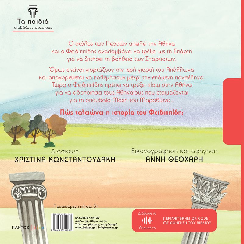 Η Χριστίνα Κωνσταντουδάκη διασκευάζει την ιστορία του πρώτου μαραθωνοδρόμου, που διηγήθηκε πρώτος ο Ηρόδοτος. Εικονογράφηση και αφήγηση της Άννης Θεοχάρη.